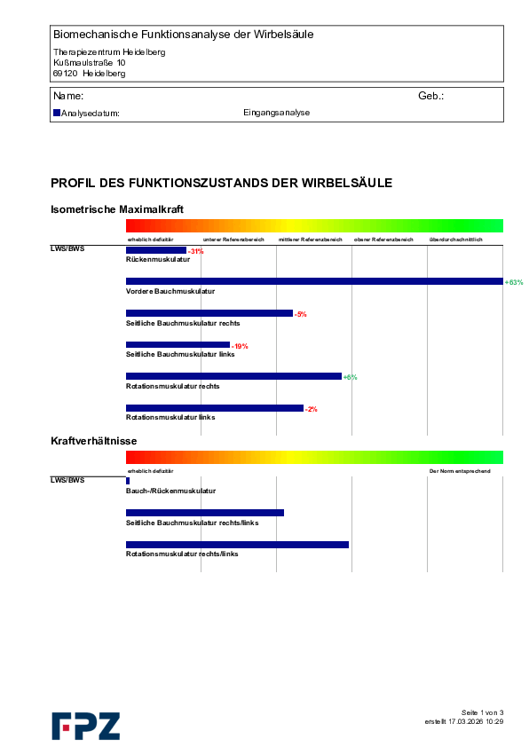 Durch eine umfangreiche computergestützte Analyse der Wirbelsäule wird die Funktion sämtlichen Muskelgruppen Ihres Rumpfes beurteilt. Man erhält somit quasi ein „EKG des Rückens“ mit der Darstellung sämtlichen Schwächen und Dysbalancen Ihrer Wirbelsäule. Die Kräftigungstherapie kann so „wie ein Medikament“ dosiert und auf Sie persönlich zugeschnitten werden.